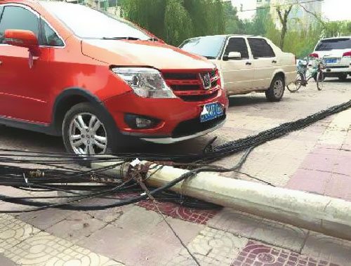 昨天上午8時(shí)許,咸陽(yáng)市渭城區(qū)向陽(yáng)一路風(fēng)和日麗小區(qū)門(mén)前人行道,電線桿上有30多根線纜,6輛車被“網(wǎng)”住,幸虧未傷及路人。